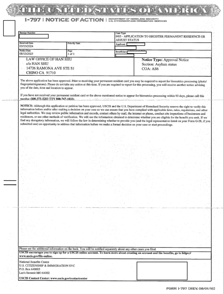 最终,在舒律师的专业代理下,移民局庇护官认可了他们的真实处境,于2025年顺利批准了全家的庇护申请。如今,他们一家终于能够在美国安心生活,享有不再受迫害的自由。
