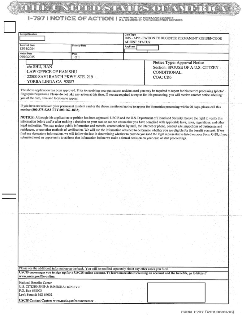 面谈当天,W先生与Z女士在舒律师及律所翻译员的陪同下准时到达。等待约50分钟后,移民官将他们叫入办公室。审阅完所有材料后,移民官充分认可了二人婚姻的真实性。整个面谈过程仅持续了20分钟,主要为一些程序性问题。面试结束时,移民官当场告知:Z女士的婚姻绿卡申请已获批准,仅需等待必要流程完成,预计在14天内即可收到绿卡。